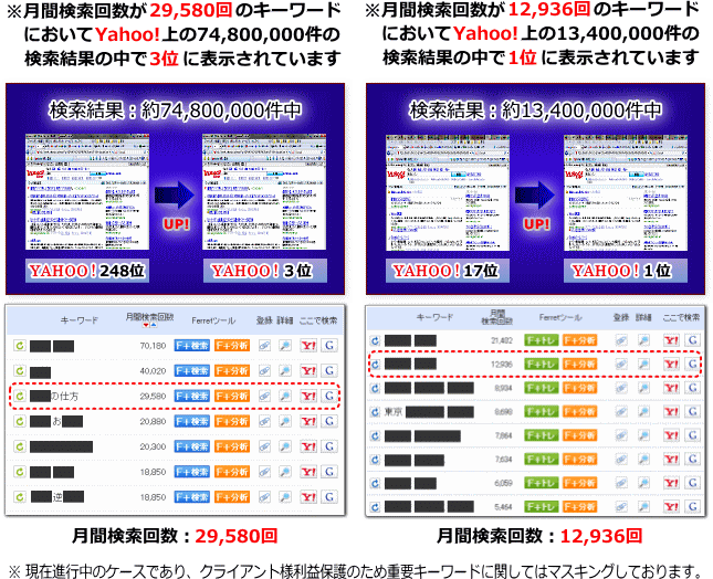 その結果、今では複数のキーワードでヤフーの5位以内に入るようになり、